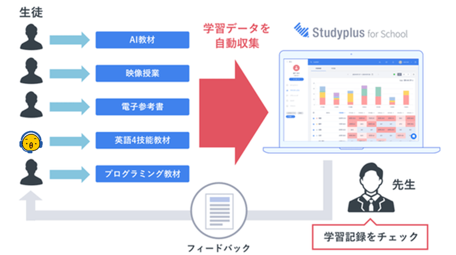 生徒の「CHATTY」での学習履歴が自動で「Studyplus for School」に記録され、学習塾や学校の先生は「Studyplus for School」の管理画面から生徒一人ひとりの学習進捗を管理することが可能となり、タイムリーに適切な生徒指導を行うことができるようになります。