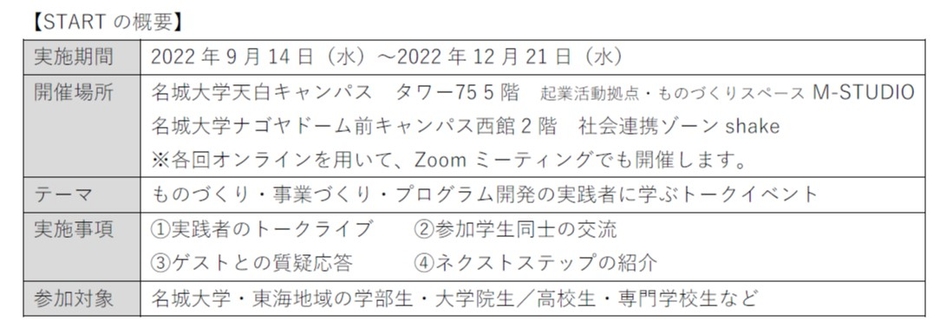 名城大学は新たな「ものづくり」「事業づくり」「プログラム開発」にチャレンジする大学生の動機形成を目的に、その実践者から学ぶトークイベント「START」を開始します。