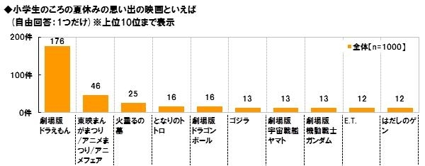 さらに、小学生のころの夏休みの思い出の映画を聞いたところ、アニメ映画が上位を独占し、1位は「劇場版ドラえもん」176件、2位は複数の劇場版アニメを同時上映した「東映まんがまつり/アニメまつり/アニメフェア」46件、3位は「火垂るの墓」25件となりました。
