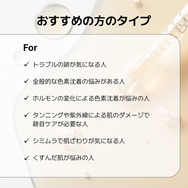 メラニン生成を防ぎ、より明るい肌へと導く「フェルラ酸」と「グルタチオン」の成分がシナジー成分として配合されており、トラブル跡ケアの効果をさらに高めます。