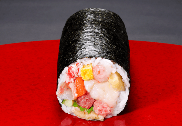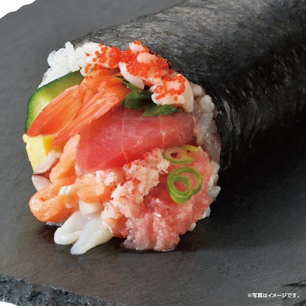 まぐろ、本ずわいがに、生サーモン、いくらなど10種の海鮮と玉子や椎茸などの巻寿司の定番具材を贅沢に使用した極太巻。