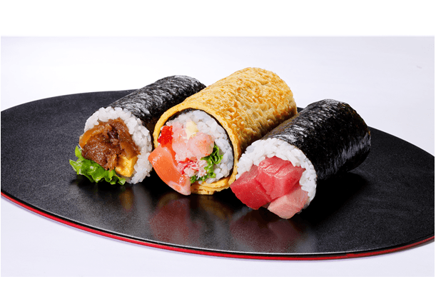 「神戸牛の太巻」「国産生本鮪三昧太巻」「生サーモン・ずわいがに入り玉子サラダ太巻」のハーフサイズが入った贅沢なセット。
