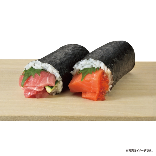 「たっぷり具っ!本鮪とろ入りまぐろ節分巻」「たっぷり具っ!サーモン節分巻」の2種類が入った、鮪とサーモンのおいしさを両方楽しめる贅沢なハーフサイズのセット。