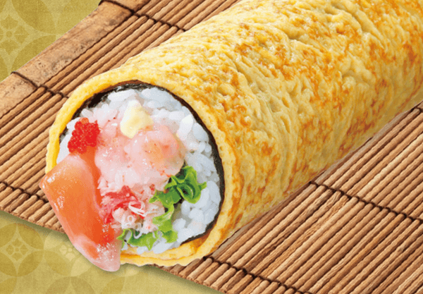 生サーモン・ずわいがに・甘海老・とびっこ・マヨネーズなどが入ったサラダ風の太巻を、錦糸玉子で巻いた太巻。