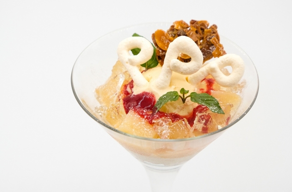 桃のコンポートと口どけのよいジュレに冷たいヴァニラアイスクリームを夏らしいグラスに盛り付け、甘酸っぱいラズベリーソースで彩りも鮮やかに。甘くてジューシーな福島の桃のおいしさを十分に引き出したシェフ鈴木啓太の特製パルフェです。