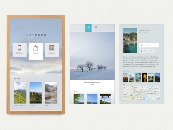 購入までの操作方法は至ってシンプル。(Atmoph Windowの操作は、Wi-Fi経由でつながったiPhone (iPod/iPad)/AndroidのAtmophアプリをリモコンとして使います。)Atmoph Windowのメニューからストアを表示し、気に入った風景動画を選び、購入ボタンをタップするだけです。購入の前にプレビュー画面にて実際の雰囲気を体験できるため、部屋に風景を試着するように、いろいろな景色を試して部屋にぴったりの風景を選ぶことができます。支払い方法はクレジットカードを簡単ステップで登録するだけ。購入後はストリーミングとダウンロードの組み合わせによって、すぐに風景を楽しむことができるようになっています。
