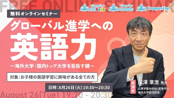 【QQキッズ/CampusTop合同無料セミナー】「グローバル進学への英語力」〜海外大学・国内トップ大学を目指す鍵〜 (8月26日(火)19:30開催)