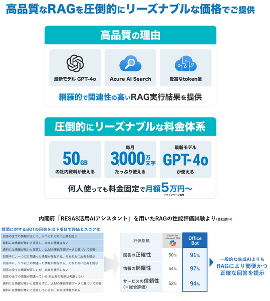 【OfficeBot】は2016年の提供開始以来、自然言語処理技術を活用したAIアシスタントサービスとして業界・業種問わず、企業や自治体を中心に幅広く導入されています。ChatGPTをはじめとする生成AIの利用拡大に伴い、日本国内でいち早くRAGに対応し、最先端AIサービスを統合、豊富な導入実績とベストプラクティスを活用した検索アルゴリズムと対話プロンプト技術による高品質なRAGをリーズナブルに提供しています。