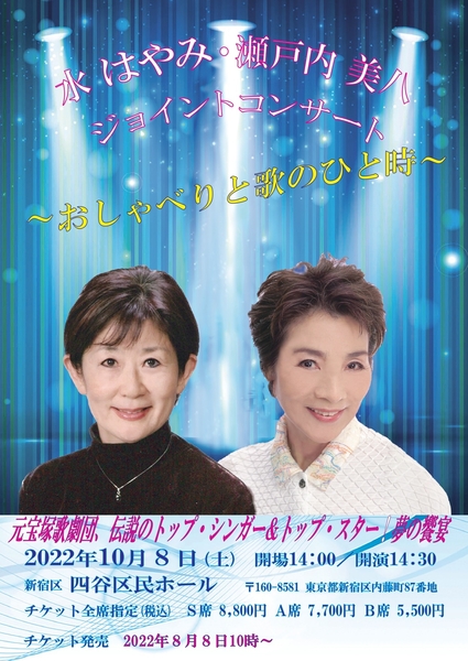 元宝塚歌劇団の伝説のトップ・シンガー 水はやみと、トップ・スター 瀬戸内美八(セトウチミヤ)の奇跡のジョイントが実現します。