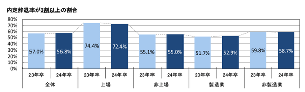 下記に示す調査結果では、上場企業であっても内定辞退率が3割を超える企業が多いことがわかります。