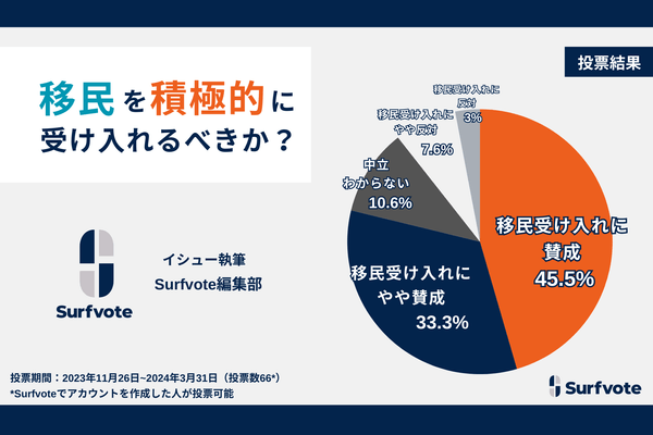 日本は移民を積極的に受け入れるべきか?Surfvoteの意見投票、78.8%が「賛成」と回答。「反対」はわずか10%にとどまった。