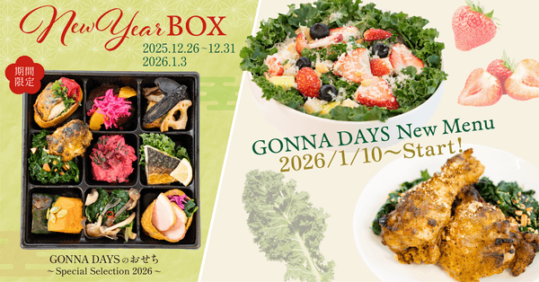 サラダ・デリカテッセンの専門店「GONNA DAYS(ゴナデイズ)」(運営:Mr. LAND 株式会社〈東京都千代田区、代表取締役社長:名塚 令〉)は、年末年始限定商品「GONNA DAYS のおせち Special Selection 2026」を発売します。自社農園の西洋野菜を使用した彩り豊かなデリカテッセンを詰め合わせた特別商品です。さらに 2026年1月10日より、新作デリカテッセン「ケールとハーブのスパイスチキングリル」「ベリー&ケールとパルミジャーノチーズのフルーツサラダ」を発売開始いたします。