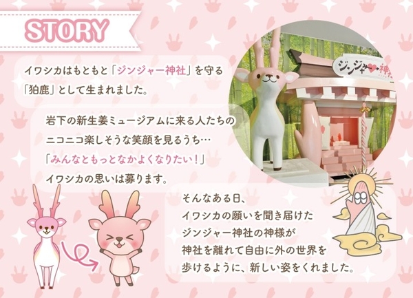 岩下の新生姜公式キャラクター「イワシカ®」は、岩下の新生姜ミュージアムの一番人気のコンテンツ「ジンジャー神社」を守る、狛犬ならぬ狛鹿。ツノが岩下の新生姜になっているピンク色のシカのキャラクターです。