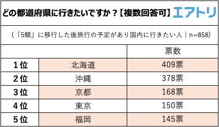 旅行を予定している、まだ予定はないがしたい、と回答し国内に行きたい人に、どの都道府県に行きたいか聞いたところ、1位「北海道(409票)」と2位「沖縄(378票)」に圧倒的に票が集まりました。3位が「京都(168票)」、4位「東京(150票)」、5位「福岡(145票)」と続きました。国内では王道の旅先と言える「北海道」と「沖縄」が根強い人気となりました。
