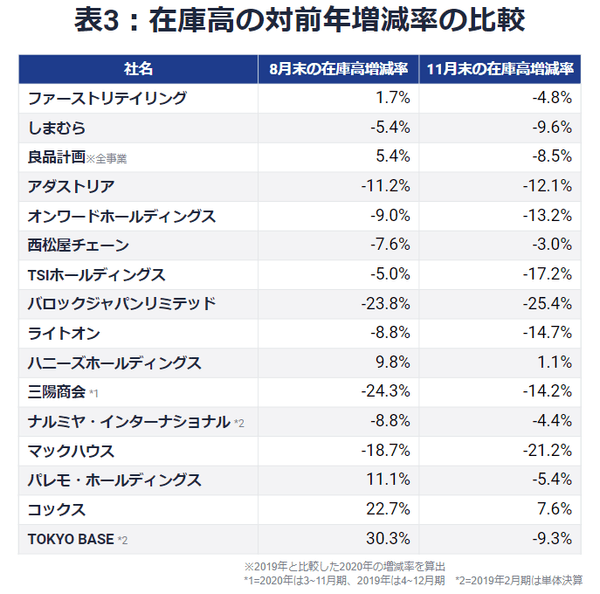 2020年11月末の対前年増減率を8月末のそれと比較したのが次頁の表3だ。2020年11月末時点の在庫高は、8月末時点よりもさらに減少していることが分かる。