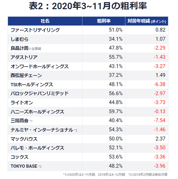 ※詳細は2020年10月22日公表の別レポート「主要アパレルのコロナ決算に見る2つの戦略。下期以降の『粗利第一』に向けた序曲に(2020年3~8月決算まとめ)」を参照(https://full-kaiten.com/news/report/2339)