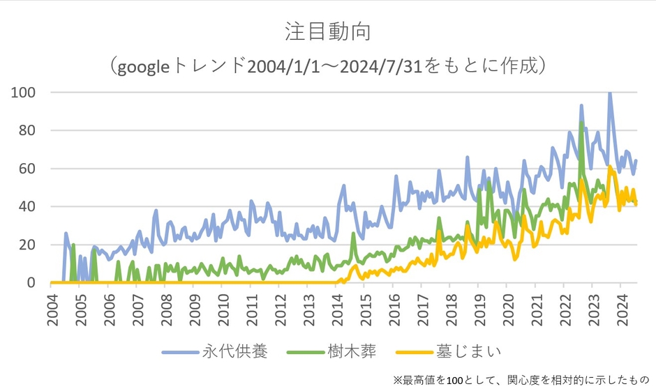 インターネット上での検索ボリュームから関心度が分かるGoogleトレンドで、お墓に関連した語句である 「永代供養」 「樹木葬」 「墓じまい」 のキーワードの検索推移をみると、1年のうちで8月のお盆前後と、9月の秋彼岸の頃が突出して検索ボリュームが高いことが分かります。