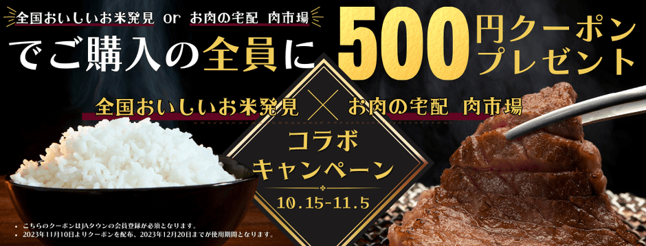 このキャンペーンは、新米と11月29日(いい肉の日)に合わせ、「全国おいしいお米発見」で商品を購入した方には「お肉の宅配 肉市場」で後日使用できる500円引きクーポン、「お肉の宅配 肉市場」で商品を購入した方には「全国おいしいお米発見」で後日使用できる500円引きクーポンをプレゼントします。