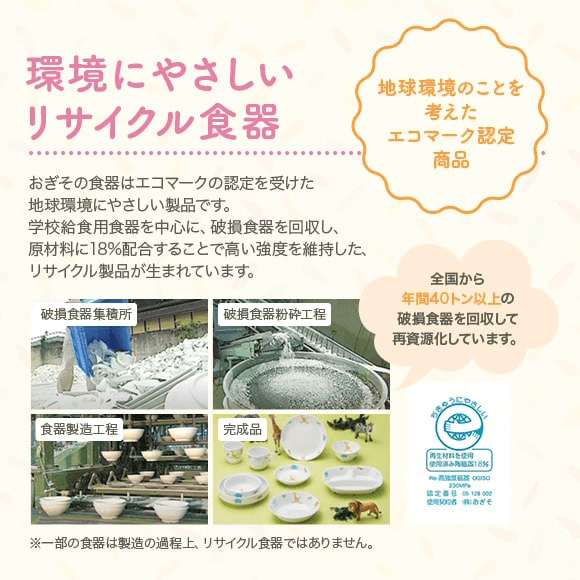 この食器は、全国の学校や施設などから回収された割れた食器を粉砕し、再び原料として活用して作られた、環境に配慮した食器です。