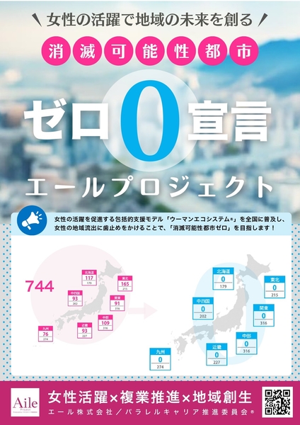 エール株式会社は、上記の課題を解決するため、女性の活躍を促進する包括的支援モデル「ウーマンエコシステム®」を全国に普及することで 、「消滅可能性都市ゼロ」を目指しています 。