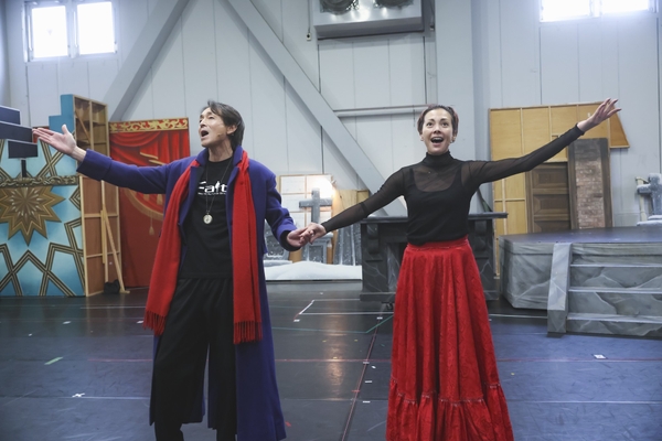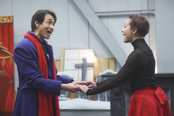 最初に公開されたシーンは、過去のクリスマスの精霊に導かれたスクルージが、青年時代の自分が愛する女性イザベラにプロポーズをする瞬間を見て、若き日の愛情をよみがえらせるシーン。欲ではなく、愛に満ちていたかつての自分を見つめるスクルージの心震える様子を繊細に演じる吉田栄作。土屋アンナの優しく温かな歌声もとても新鮮だ。続いては、時間旅行を終えたスクルージと、吉田要士が扮する親友マーレイが歌うクライマックスのシーンへ。ふたりの絆を感じさせる豊かな歌声が稽古場に響いた。そして全キャストがクリスマスナンバーにのせて歌い踊る楽しいカーテンコールが披露された。