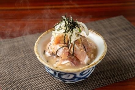 新鮮な寒ブリを特製の大吟醸胡麻ダレに漬け込み、香ばしいほうじ茶の出汁をかけていただく贅沢なお茶漬けです。温かい出汁でさらりといただける、体にやさしい朝の一杯です。
