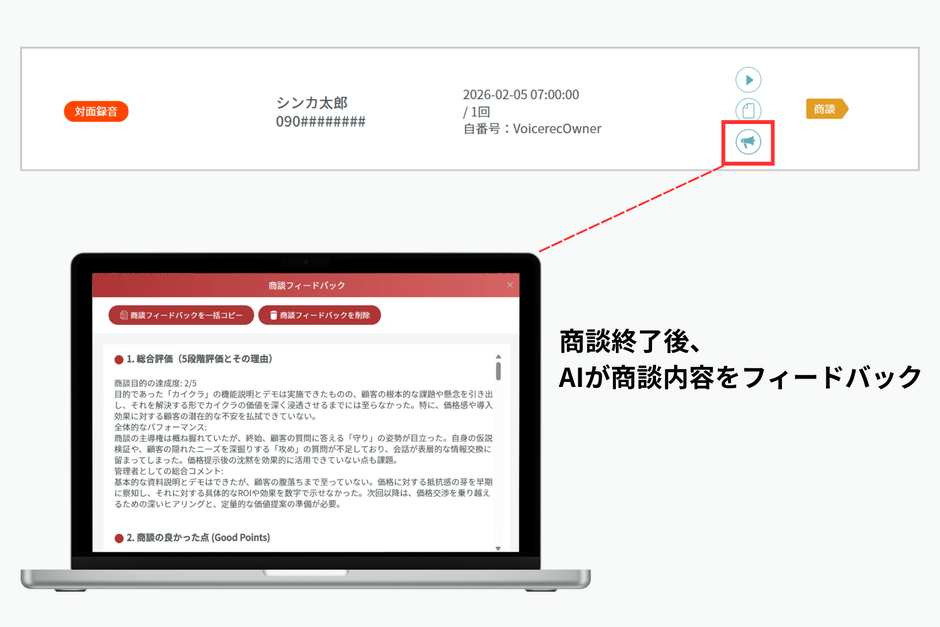 対面商談の録音終了後、生成AIが内容を解析し、具体的なアドバイスや振り返りポイントを提示します。上司が同席せずとも、担当者は客観的なフィードバックを得られるため、セルフコーチングが促進され、組織全体の営業品質の底上げに寄与します。