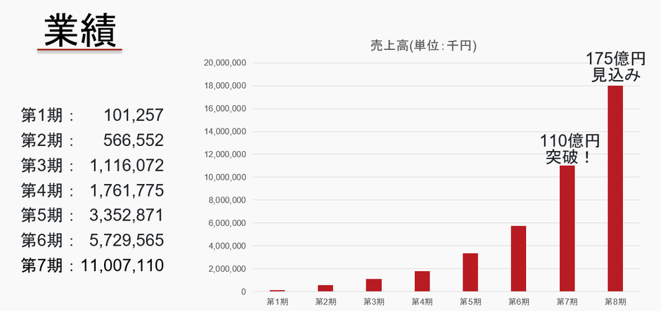 社会的なニーズの高さもあり、コロナ禍においても成長を止めることなく、この7年間で創業時売上対比110倍という飛躍的な成長を遂げることができました。
