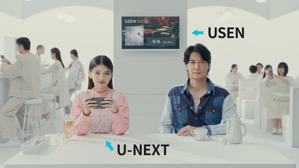 素敵なカフェで「USEN MUSIC」から聞こえてくるのは福山さんの『桜坂 2024※』。一方同じ空間でスマホを見ている出口さんの手元には「U-NEXT」に映る福山さん出演のドラマや映画が。そしてそのカフェで使われているモバイルオーダー、キャッシュレス、エネルギー、通信・Wi-Fi、ロボットまで…実は「これ、全部やってます!」。最後のお2人の驚きのカットも見どころです。
