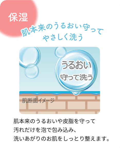 植物性アミノ酸系のマイルドな洗浄成分を使用。さらに、ママのおなかの『胎脂』に含まれている成分に類似した「うるおい補給成分(※1)」と「天然成分ヨモギエキス」を保湿成分として配合し、洗い上がりの肌をしっとり整えます。
