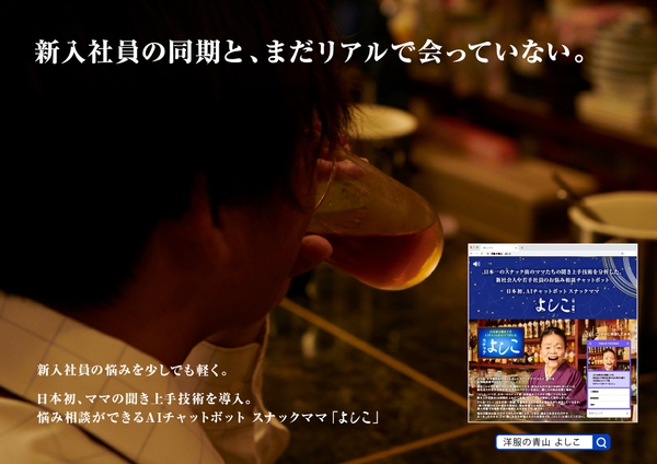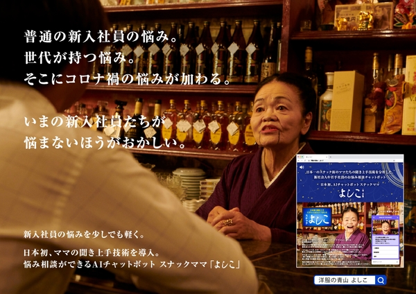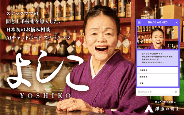 青山商事株式会社(本社:広島県福山市、代表取締役社長:青山 理)は、長引く新型コロナウイルスの影響でストレスや仕事の悩みを抱える働く若者をサポートし、ビジネスパーソンとの関係を強化するための新たな取り組みの1つとして、いつでもどこでも悩みを聞いてくれる日本初、スナックのママたちをAI化したお悩み相談チャットボットサービス:AIチャットボット スナックママ「よしこ」(無料)を洋服の青山公式サイトにて、7月7日(水)より公開します。