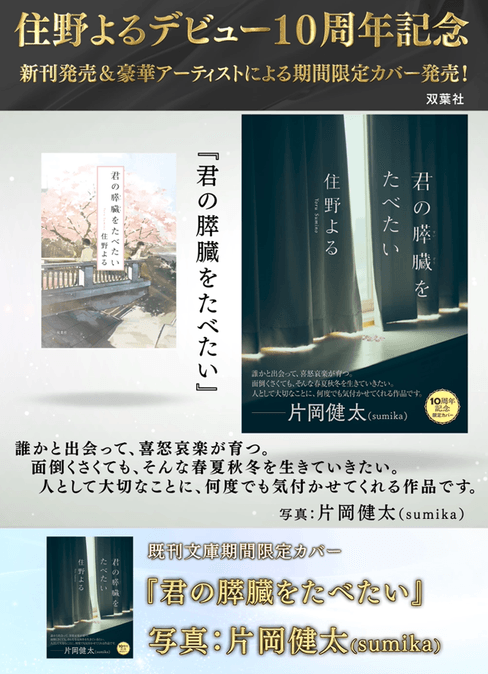 先日、住野よる先生から発表された、新刊文庫『腹を割ったら血が出るだけさ』の発売に加え、『君の膵臓をたべたい』×片岡健太(sumika)、『また、同じ夢を見ていた』×ヨシタケシンスケ、『よるのばけもの』×堀越耕平の期間限定カバーが非常に話題となっている、10周年記念施策がいよいよ8月6日より本格スタートします。