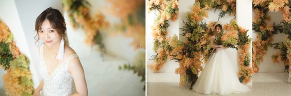 奥行きのあるスタジオに飾られた立体感のあるお花。アップと全身、光と影など撮影のしかたでさまざまな表情を見せてくれます。壁とおそろいで、ボリューム満点、ふわふわと可愛らしいブーケもご用意しました。
