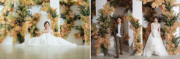 スタジオTVB神戸ハーバーランド店のフラワースタジオは、スモークツリーやユーカリを組み合わせ、淡いオレンジとグリーンカラーで統一。お花が背景になることで、ウェディングらしい特別感もありながら、ナチュラルな印象の写真を撮ることができるスタジオです。