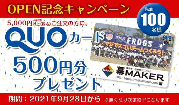 オープンを記念して、コンビニやドラッグストアでもご使用できるQUOカード500円分をプレゼントいたします。初めて幕メーカーをご利用のお客様先着100名様限定となりますので、この機会にぜひ幕メーカーをご検討ください。