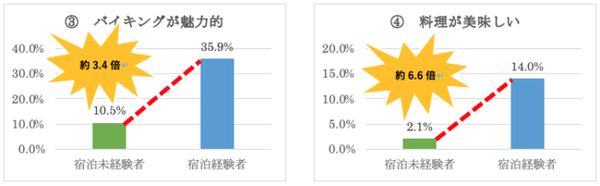 グラフ③④が示す通り、実際宿泊されることによりバイキングへの評価が大きく変わることが窺われます。