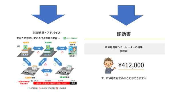 現在の想定している運用が、事業法のIT点呼規則に合致しているか判断できないという声を多く聞きます。どんな運用ならOKなのかNGなのか? を「はい」「いいえ」を答えるだけで簡単にシミュレーションできます。また、現在使用している機器に何を追加すればIT点呼を始められるのか、投資費用も「はい」「いいえ」に答えるだけでシミュレーションできます。