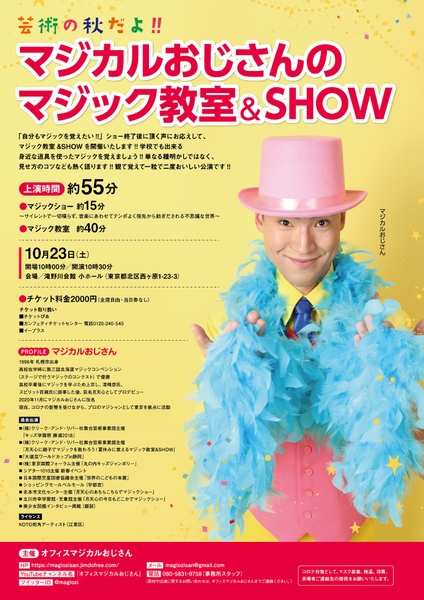 オフィスマジカルおじさん主催による「芸術の秋だよ!!マジカルおじさんのマジック教室&SHOW」が2021年10⽉23⽇(土)に滝野川会館 小ホール(東京都北区)にて開催されます。チケットはカンフェティ(運営:ロングラン プランニング株式会社、東京都新宿区、代表取締役:榑松 ⼤剛)にて10⽉12⽇(火)より一般販売開始です。