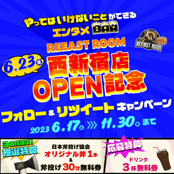 REEAST ROOM 西新宿店 が2023年06月23日(金)にオープンすることを記念して、フォロー&リツイートキャンペーンを実施します。