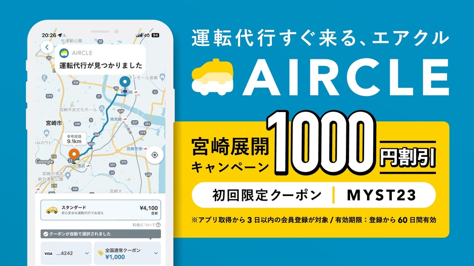運転代行配車プラットフォーム「AIRCLE(エアクル)」2023年9月1日より宮崎県にてサービス提供開始