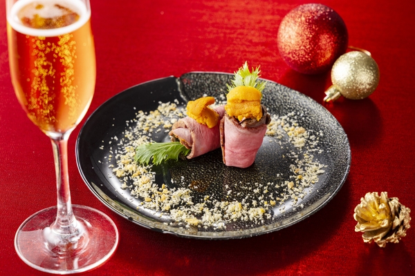 12月22日(月)、24日(水)、25日(木)の3日間限定で、「チャイニーズ・ルージュ・アフタヌーンティー」がスペシャルバージョンとして登場します。通常の13種類のメニューに加え、雲丹を宝石に見立てた「オレンジサファイア ローストビーフ ~フォアグラと雲丹を添えて~」をご提供します。フォアグラと甜麵醬ベースの特製ソースを風味豊かなローストビーフで丁寧に巻き込み、その上に濃厚な雲丹を贅沢に添えることで、まるで宝石のような輝きを放つ華やかな一皿に仕上げました。さらに、クリスマスを祝うにふさわしい乾杯のグラスシャンパン付き。特別な日を彩る、豪華なメニューを心ゆくまでお楽しみください。