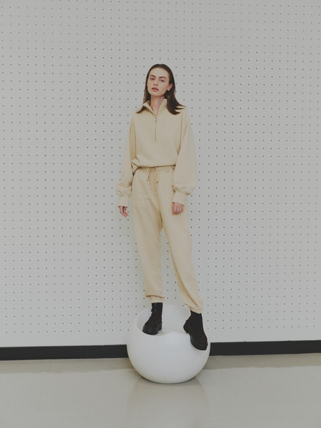 パウダー加工によるヴィンテージっぽい素材はこなれ感を演出し、トップスは立体的なシルエットを描きながら幅広のリブで裾をタイトに絞り、ボトムにもIN しやすいデザインに!またジップを配し立ち上げたネック部分がシャープさを添えます。