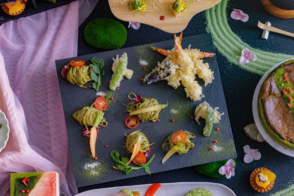 お料理には、ハスカップ ザ・ガーデン料理長・山本 昭典(やまもと あきのり)が、抹茶を取り入れてアレンジした世界各国のメニューをご用意。オープンキッチンからは、揚げたての天ぷらを抹茶塩で味わった後、出汁を注いで「だし茶漬け」としても楽しめる一品が登場します。さらに、抹茶とチーズを組み合わせ、青のりで香りのアクセントを添えた「抹茶チーズと青のりのカルボナーラ」など、和洋多彩な味わいをお楽しみいただけます。