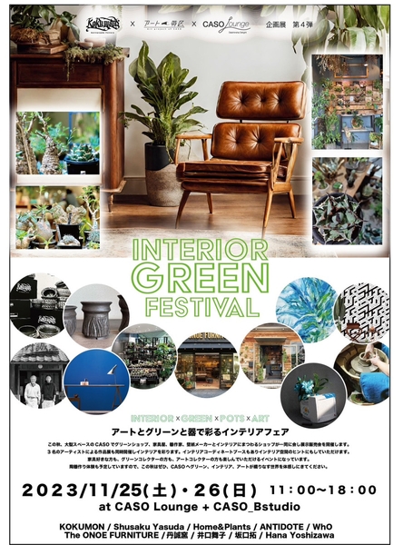 本イベントはCASOアート特区プロジェクトが運営するCASO Loungeの企画展第4弾。陶芸家ユニット「KOKUMON」とタッグを組み、家具屋、壁紙メーカー、グリーンショップ、器、アートの展示販売会となります。ヴィンテージ系からナチュラルテイストまで多彩なスタイルの家具、流行りの多肉植物・観葉植物、植木鉢を中心とした器の販売。また、3名アーティストによる植物にまつわるアート作品の展示も販売予定です。