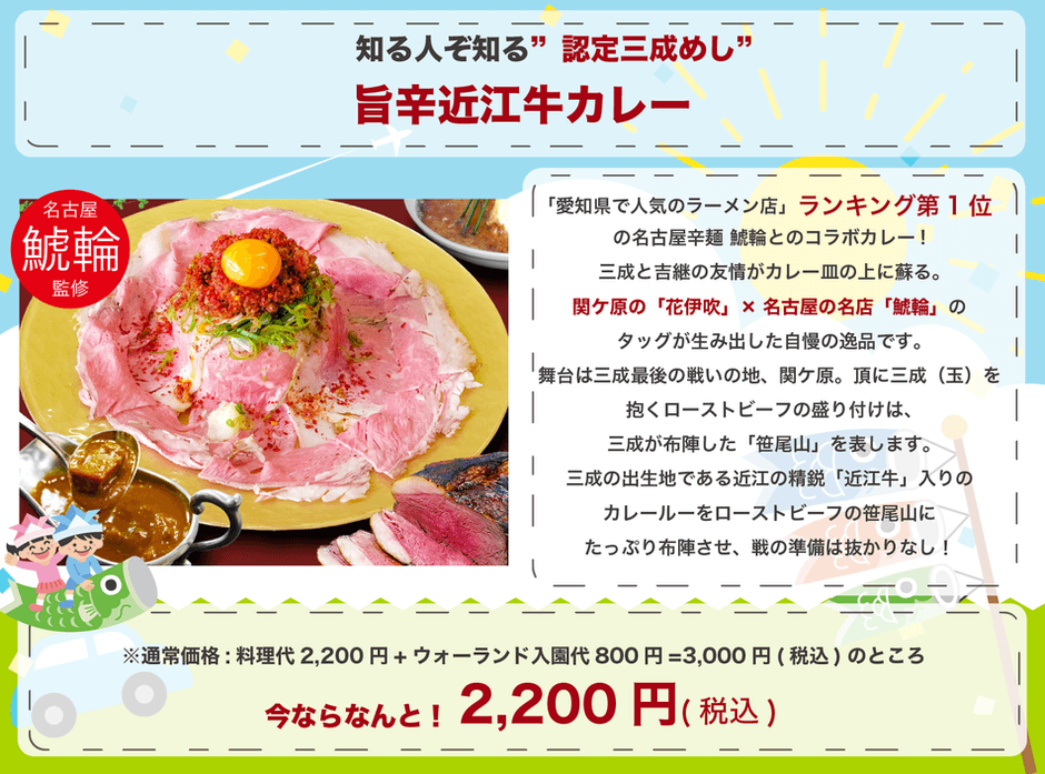 ※「三成めし」とは彦根・米原・長浜市内の飲食店などが、石田三成をテーマに考案したもので、びわ湖・近江路観光圏活性化協議会さんによる審査で一定の認定基準をクリアした飲食メニューです。