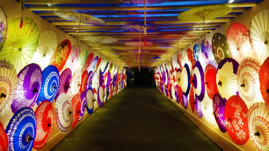 <夜の部> ライトアップされた和傘はとても素敵なイルミネーションになり、夜は夜の楽しみ方に。和傘だからこそできる物語をご覧ください。