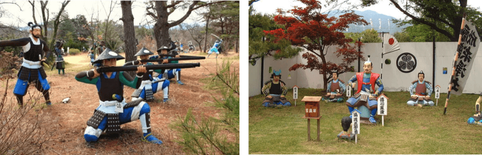関ケ原合戦を再現したテーマパーク型資料館です。約 30,000 ㎡の敷地内に、コンクリート像作家:浅野祥雲作の極彩色のコンクリート製等身大武将像を、史実にもとづき、豊臣軍と徳川軍の陣地に配置しています。戦国の雰囲気を感じられるよう、甲冑レンタルも行っています。屋外展示のほか、参加型ゲーム、関ヶ原合戦屏風を展示する資料館もあります。