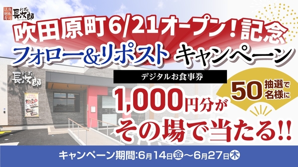 吹田原町店オープン記念として2024年6月27日(木)まで、「デジタルお食事券1,000円分」がその場で50名様に当たる、お得なXキャンペーンを開催します。にぎり長次郎のX公式アカウントをフォローし、キャンペーンポストをリポストすることで抽選いただけます。本お食事券はにぎり長次郎各店舗で1,000円以上のお食事をしていただく際にご利用いただけます。