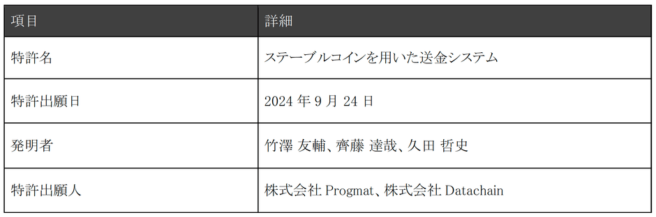 株式会社Datachain(代表取締役:久田哲史、以下「Datachain」)およびProgmat, Inc.(代表取締役:齊藤達哉、以下「Progmat」)は、Swiftシステムと連携したステーブルコインによる国際送金システムに関する特許出願が完了したことをお知らせいたします。