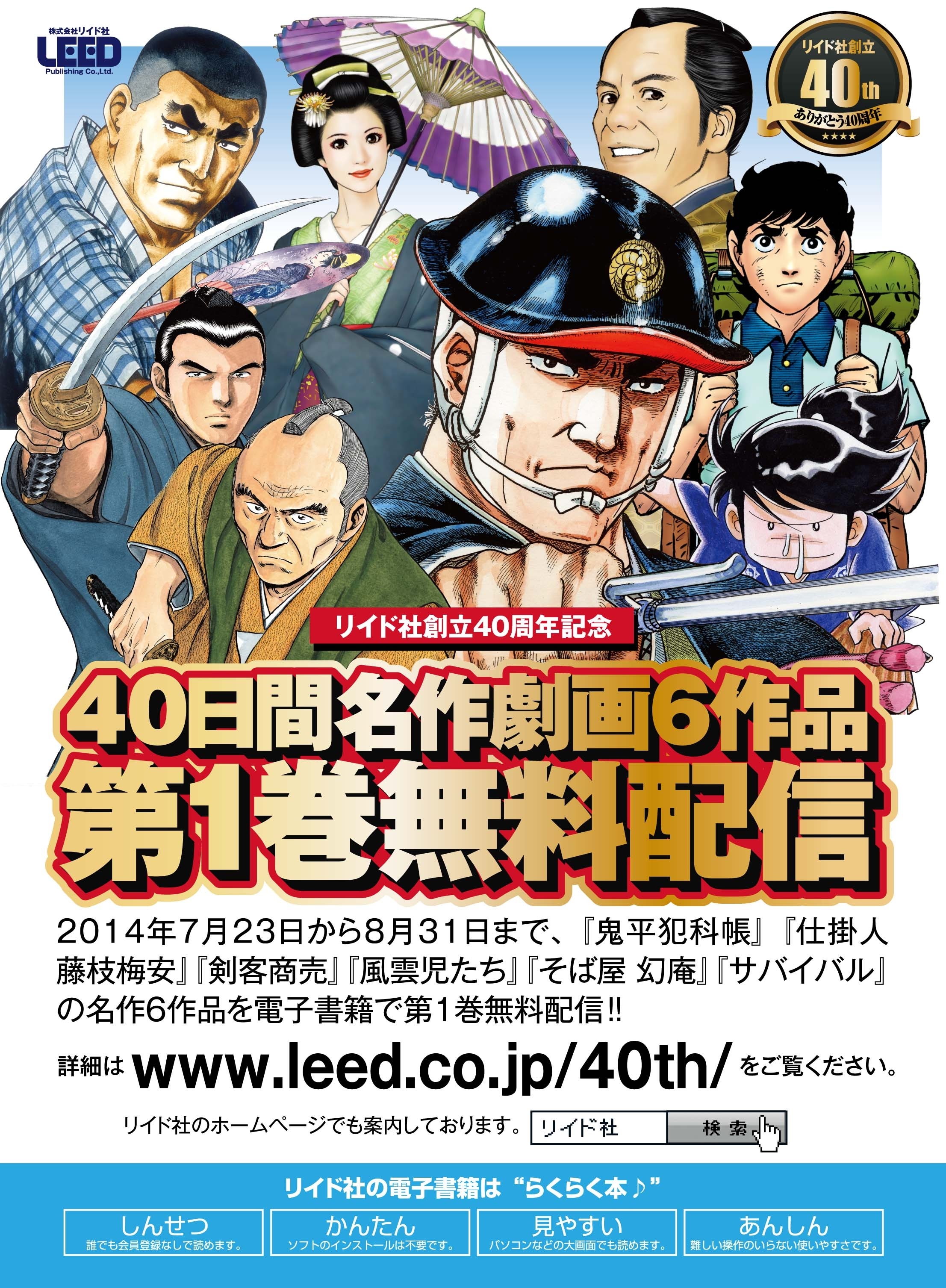 リイド社は創立40周年を記念して、2014年7月23日から8月31日まで、『鬼平犯科帳』『仕掛人藤枝梅安』『剣客商売』『風雲児たち』『そば屋幻庵』『サバイバル』の名作6作品において第1巻を電子書籍で無料配信を行う『40日間名作劇画6作品第1巻無料配信』を発表いたします。